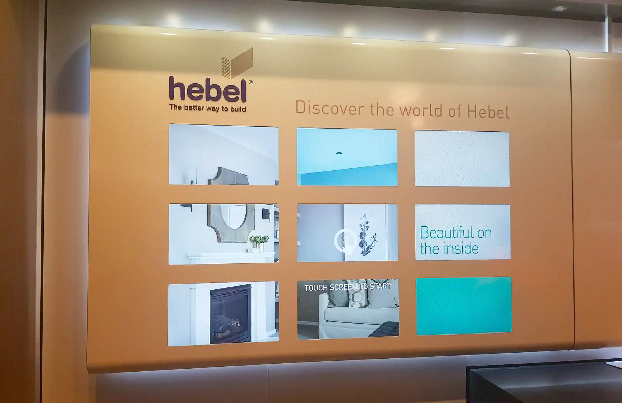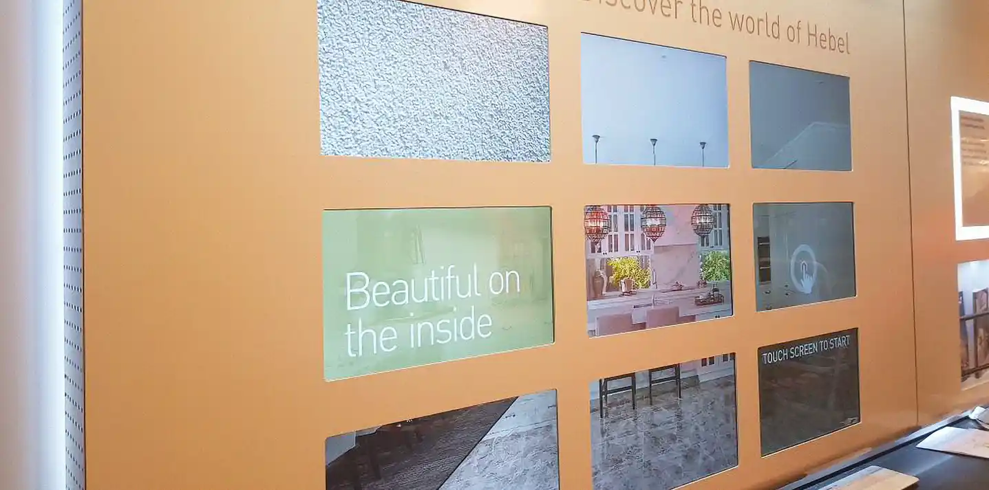 Informing clients of the various benefits of using Hebel as a building material, as well as making a bold and signature statement, Interactivity delivered a 9 screen touchable Video Wall with a bespoke software program designed specifically for Hebel.