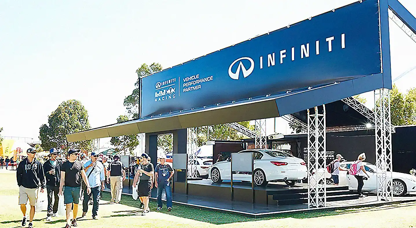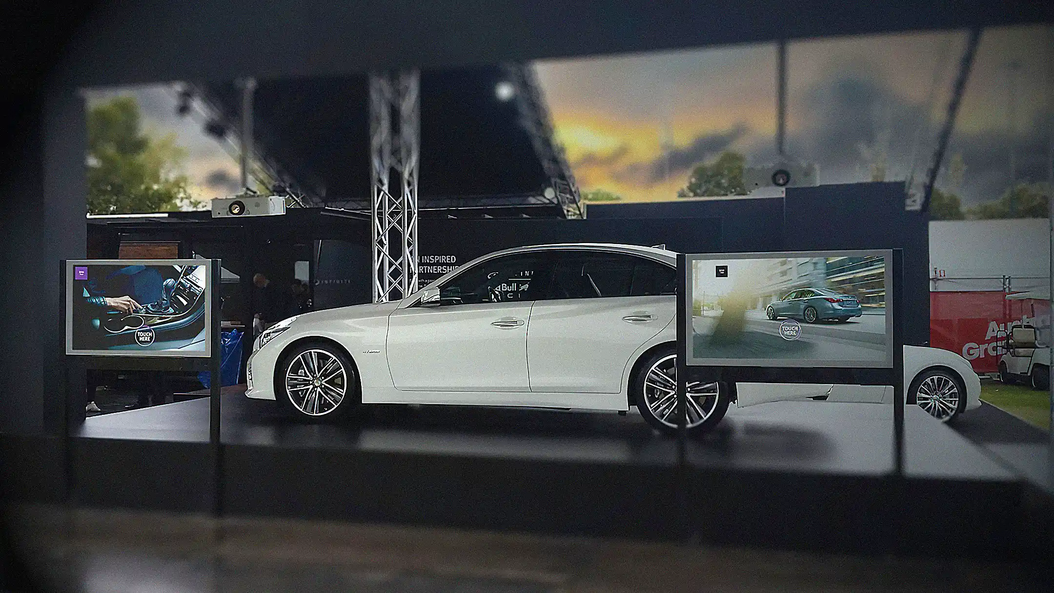 It begins not with a new coat of paint, but by having fresh thinking, a new attitude and a new way of displaying the similarities between the F1 car and the Infiniti. By using floating screens and rear projection mounted to the ceiling frame, it allows Infiniti to show off features of their car in a seamless and aesthetically pleasing manner.