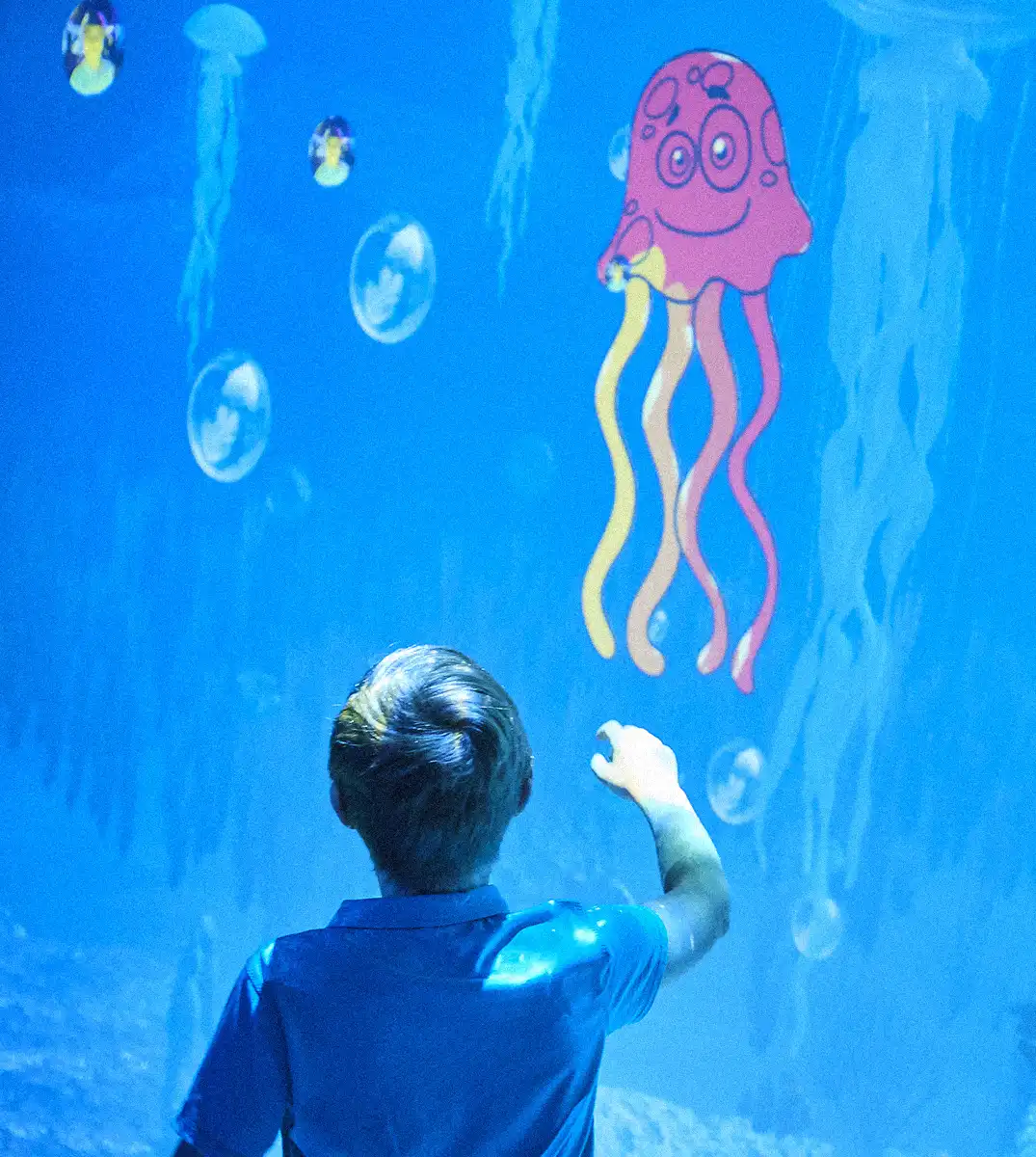 Finally, in the art aquarium, guests are invited to play games and even take a selfie after colouring in their jellyfish so they can interact with it on the giant Interactive Wall & Floor!