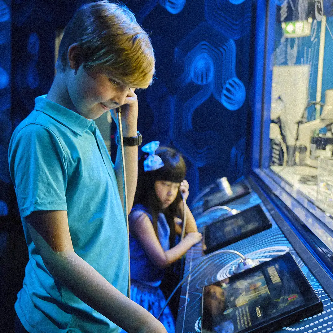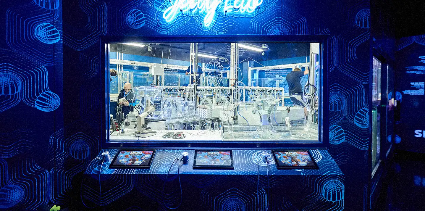 Control the invasion of Jellyfish on a tablet by changing the Temperature, Nutrients and Predator levels which alters the amount of Jellyfish and Predators on two giant rear projection screens shown on the bank of 3 meter tanks! Walk over another rear projected tank of Jellyfish whilst trying not to step on them. Move into the Jelly lab where you can watch extensive videos on the Anatomy and the Lifecycle of the Jellyfish.